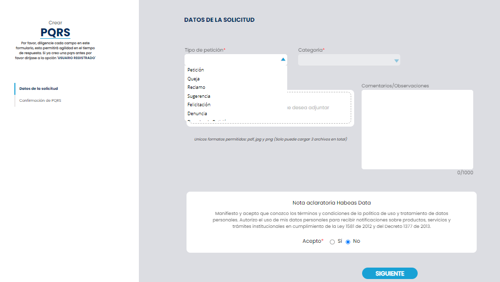 4. A continuación podrá crear su PQRS seleccionando el tipo de petición y categoría que más se ajuste. En la casilla de Comentarios/Observaciones sea lo más detallado posible y si tiene algún documento relacionado con su PQRS no olvide adjuntarlo